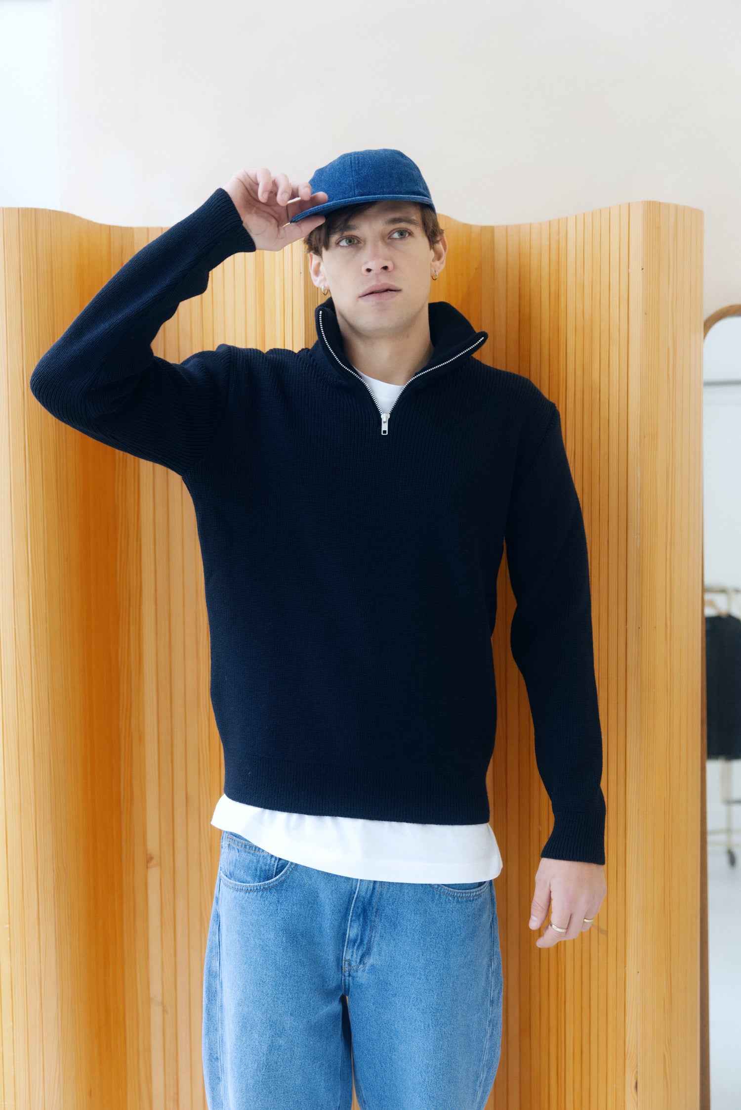 Auguste le mannequin avec une casquette porte une taille M il mesure 1m86 pour 72 kilos