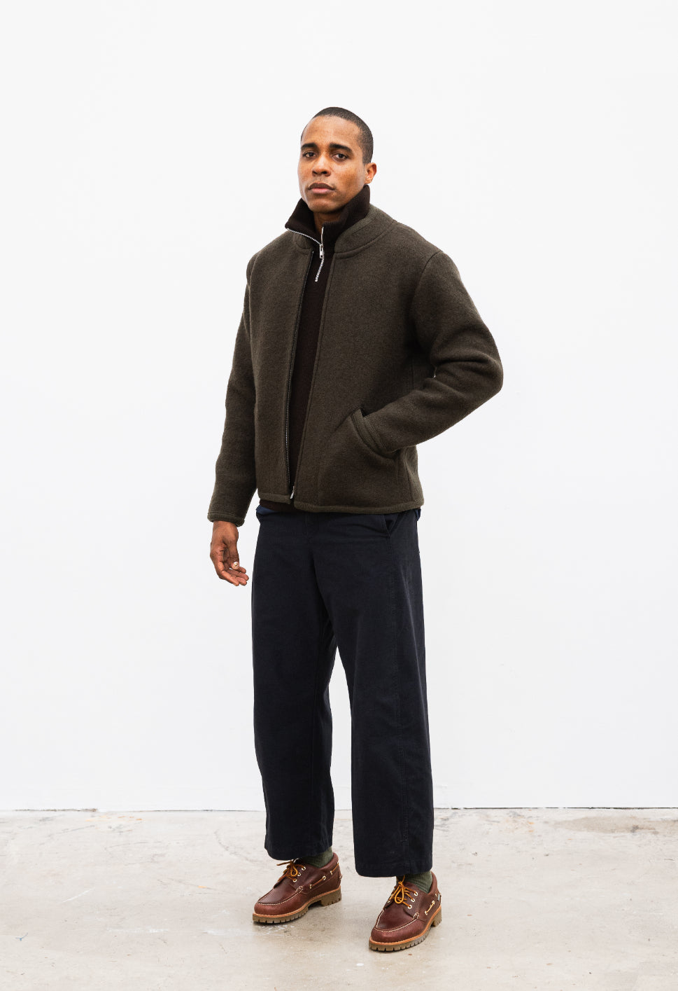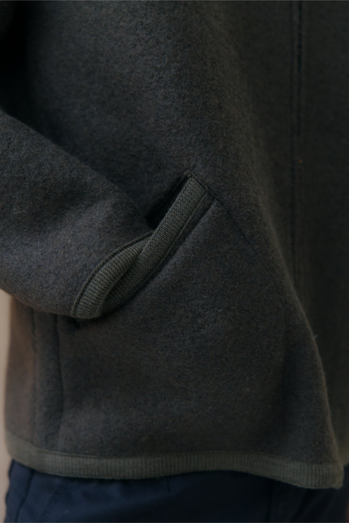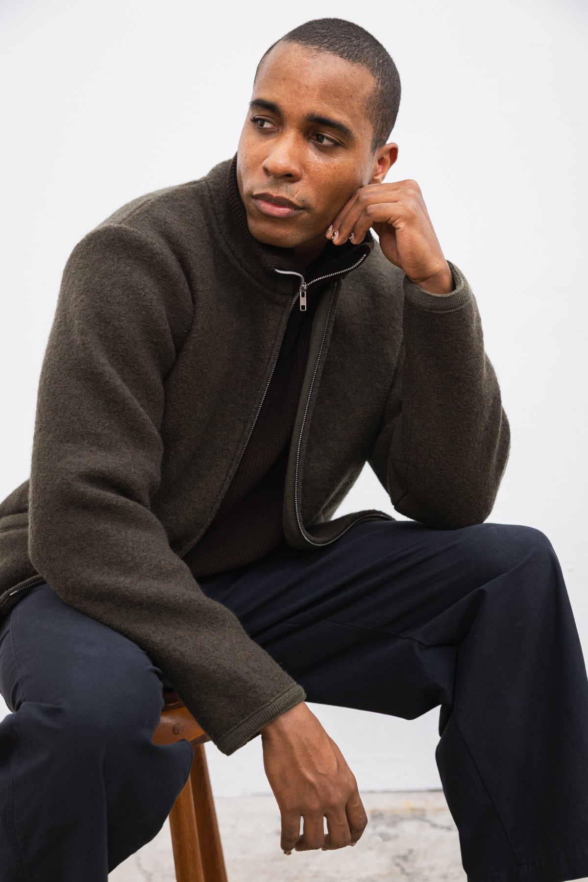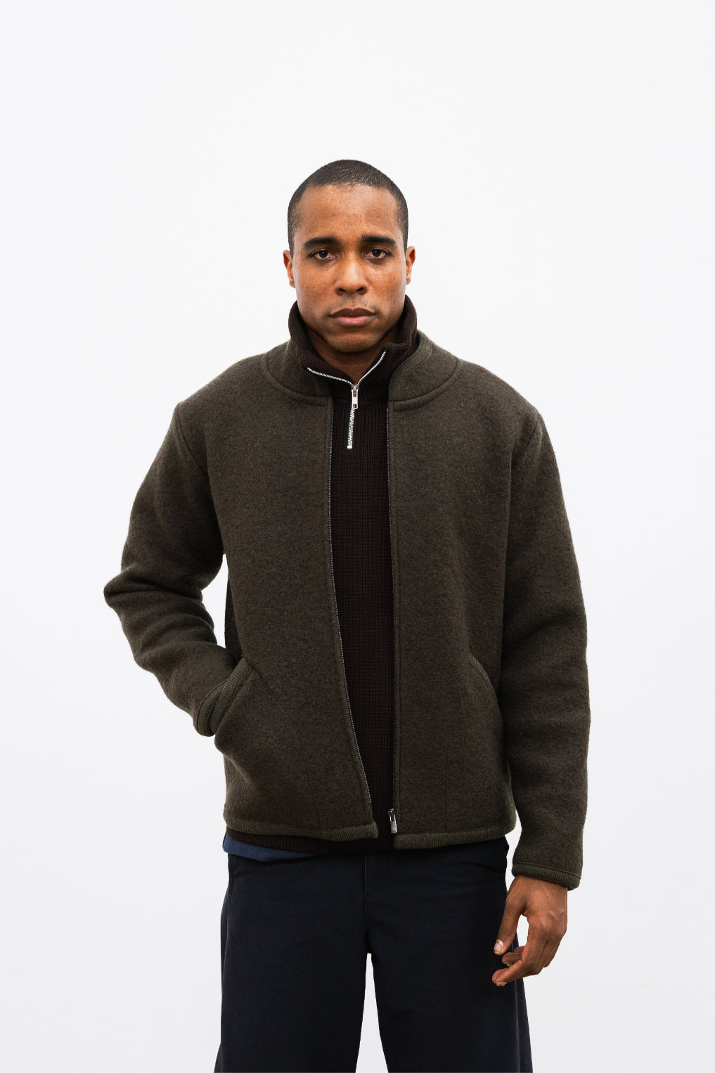 Le veste TANA en laine bouillie kaki est très chaude et ultra-résistante. La laine bouillie est réalisée directement dans nos ateliers à Roanne pour garantir un rendu d'exception et une traçabilité totale du process.