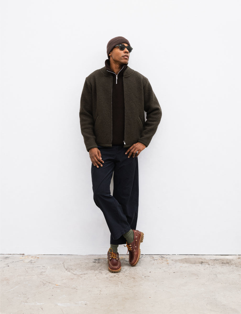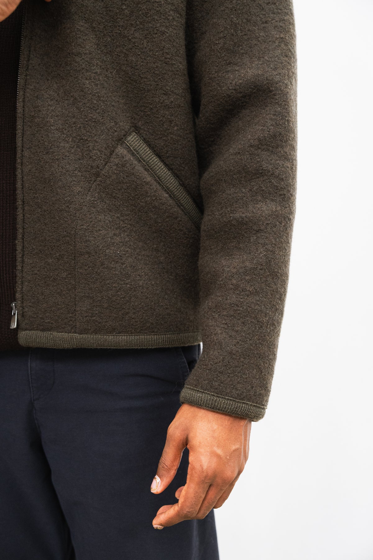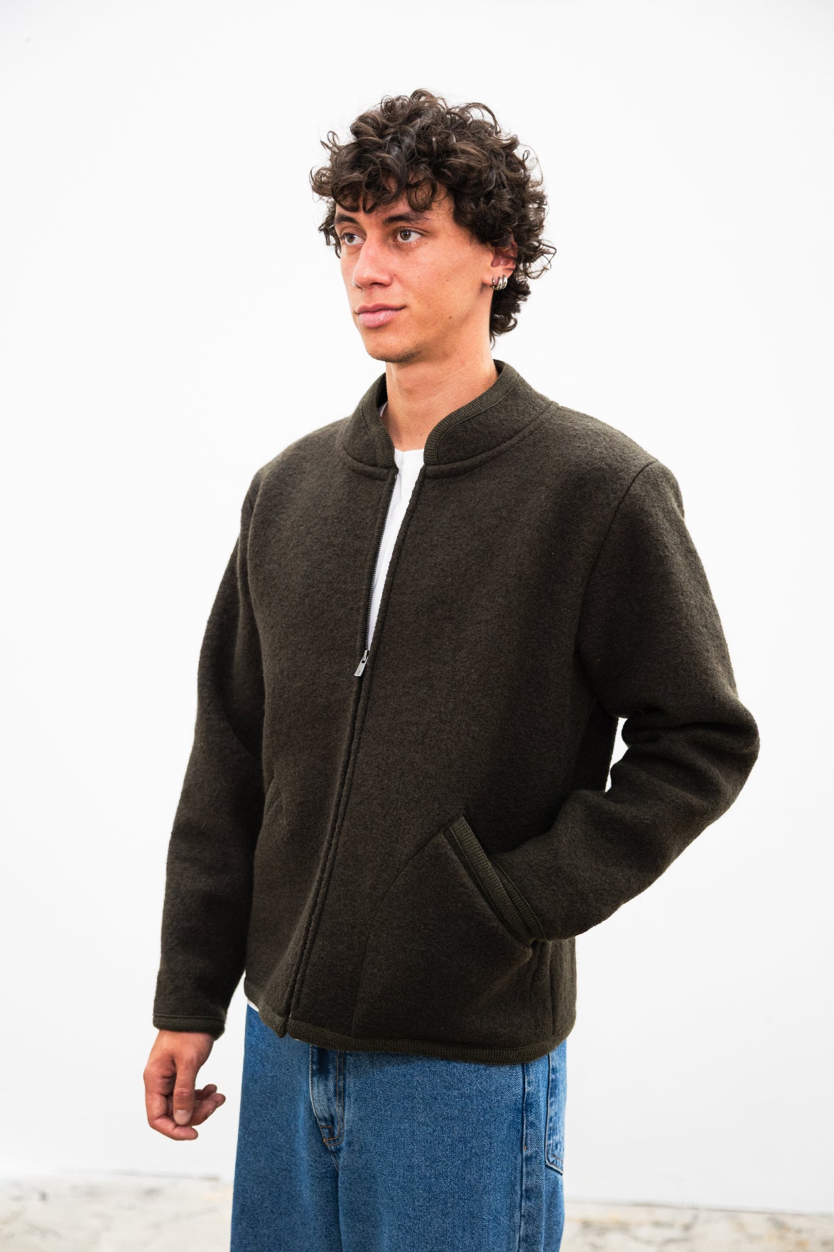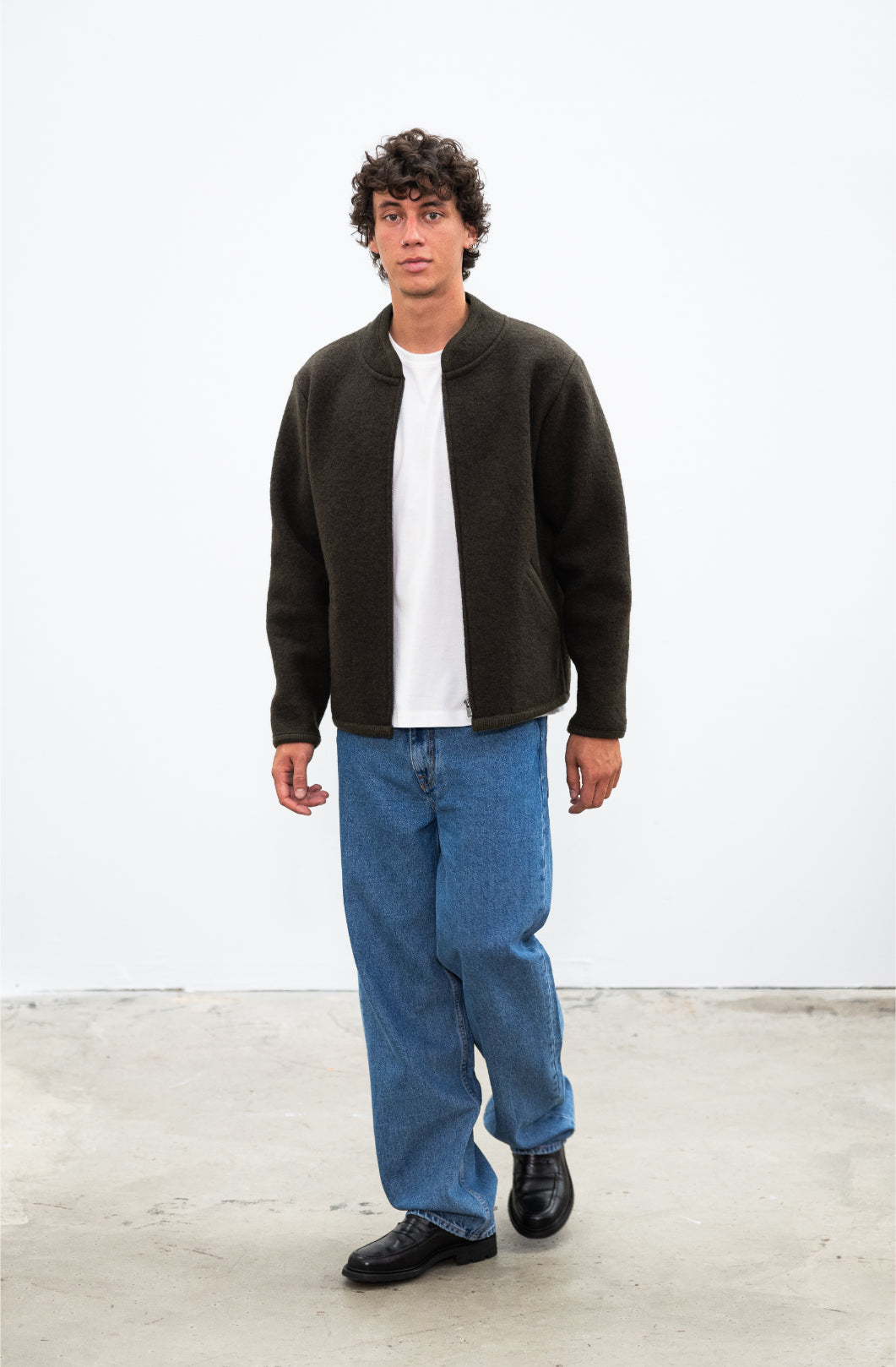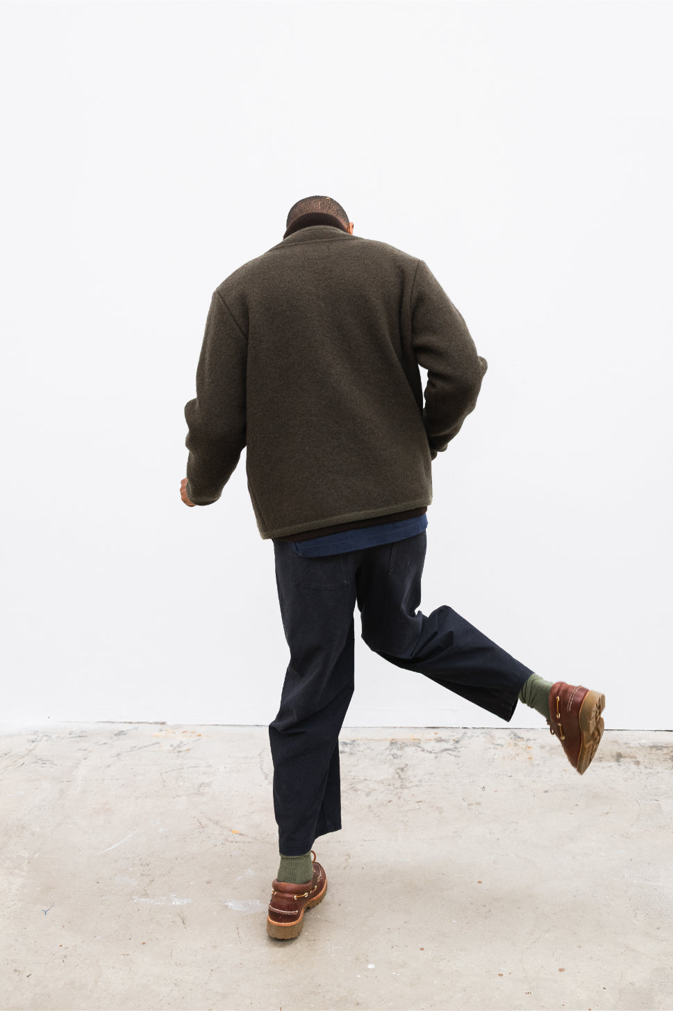 Le veste TANA en laine bouillie kaki est très chaude et ultra-résistante. La laine bouillie est réalisée directement dans nos ateliers à Roanne pour garantir un rendu d'exception et une traçabilité totale du process.